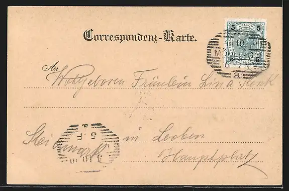 Personenbezogene Daten auf der Rückseite der Karte wurden durch blauen Textmarker unkenntlich gemacht. Die blauen Stellen sind auf die Vorderseite durchgeweicht und wirken sich negativ auf das Postkartenfoto aus