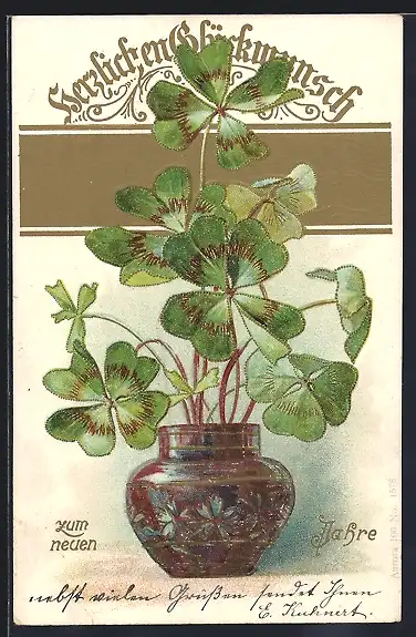 AK Kleeblätter in einem Topf, Neujahrsgrüsse