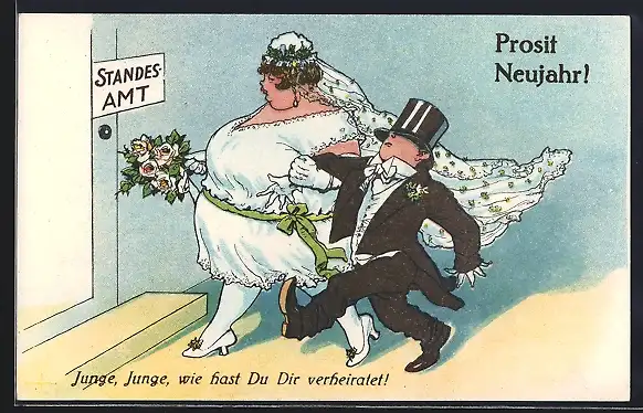 AK Klein geratener Bräutigam mit dicker Riesendame vor dem Standesamt, Neujahrsgruss