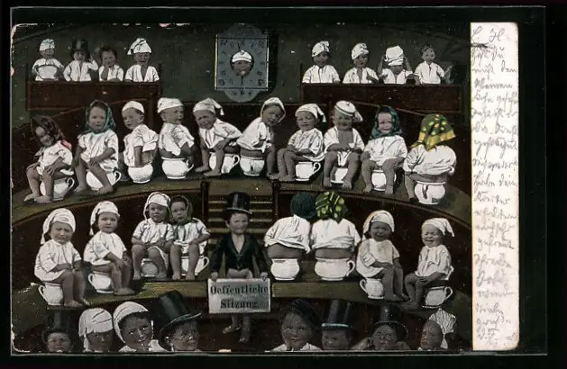 AK Kleine Kinder auf Töpfchen, Oeffentliche Sitzung