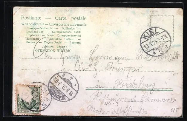 gelaufen 1903, Briefmarke tw. entfernt, rückseitig Oberflächenschaden, Eckknick re. oben, guter Zustand