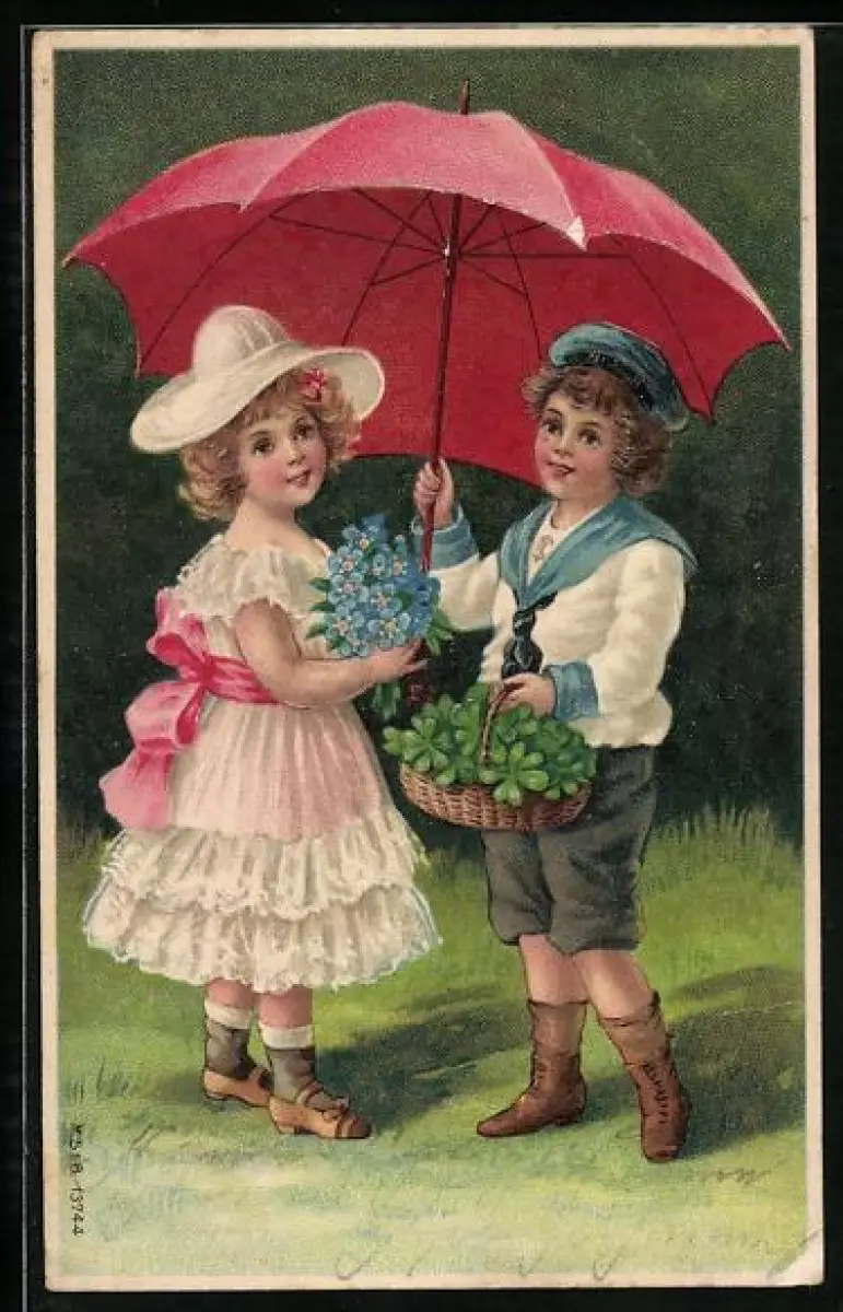 AK Kleine Kinder unter Sonnenschirm mit Blumenstrauss und Kleeblättern