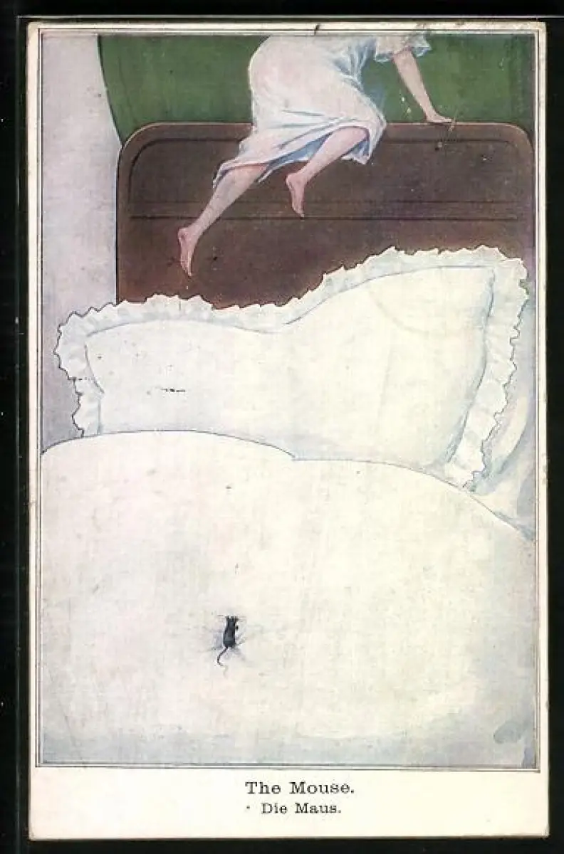 AK Kleine Maus verscheucht eine Dame aus dem Bett