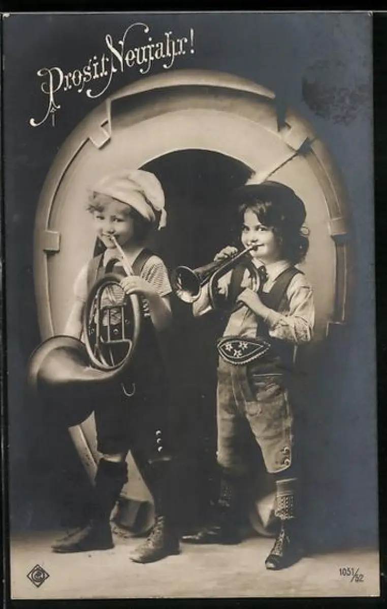 AK Kleine Musiker mit Horn und Trompete, Neujahrsgruss