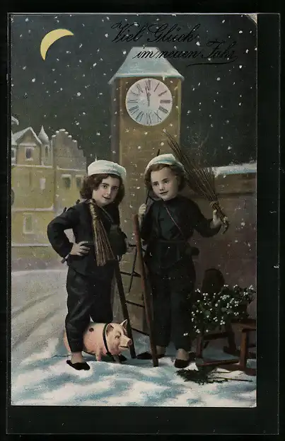 AK Kleine Schornsteinfeger stehen kurz vor Mitternacht an einer Turmuhr