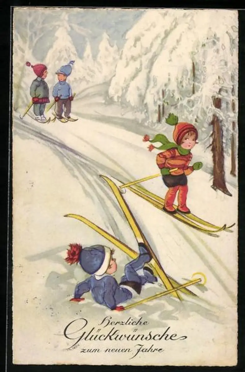 AK Kleine Skiläufer, Malheur bei der Abfahrt, Neujahrsgruss