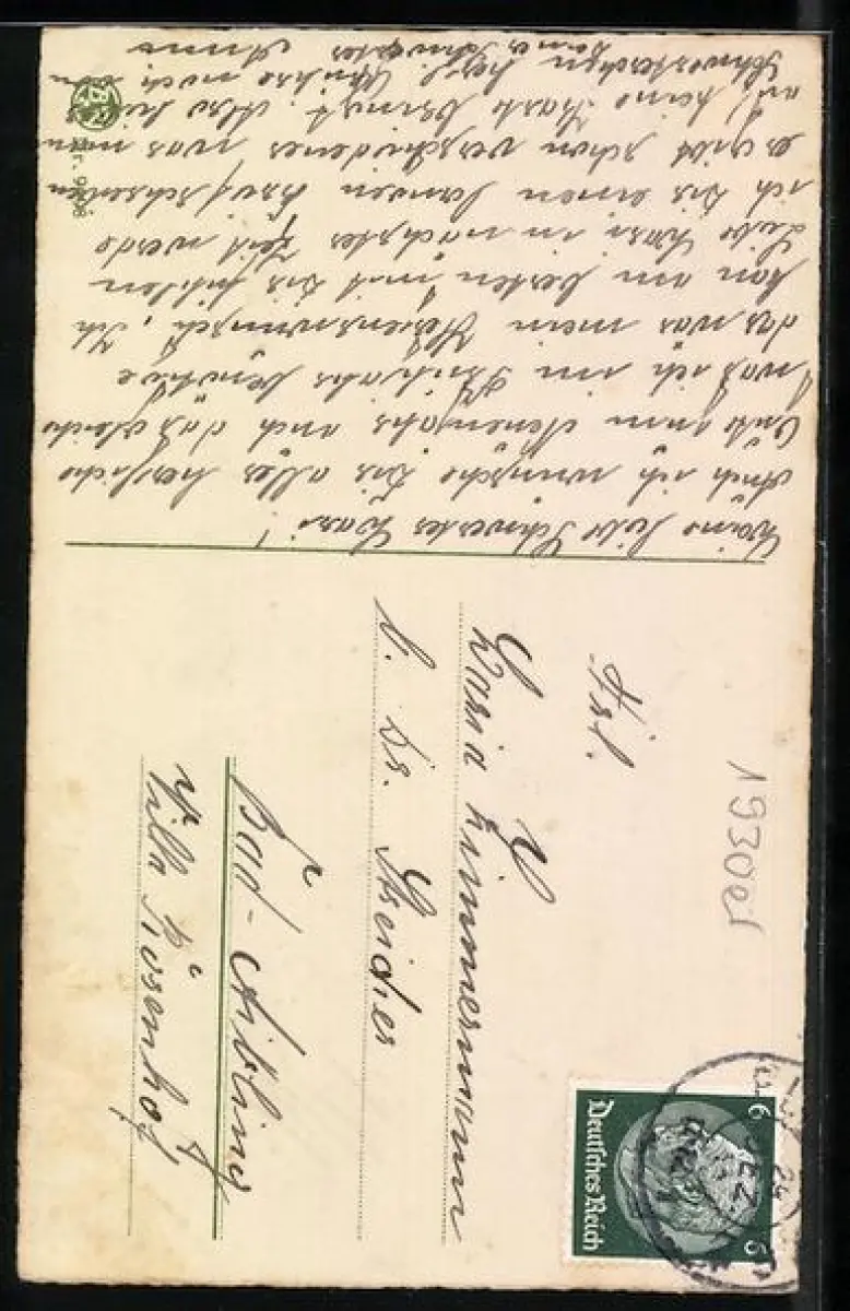 Personenbezogene Daten auf der Rückseite der Karte wurden durch blauen Textmarker unkenntlich gemacht. Die blauen Stellen sind auf die Vorderseite durchgeweicht und wirken sich negativ auf das Postkartenfoto aus