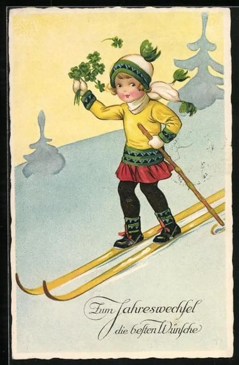 AK Kleine Skiläuferin mit Glücksklee, Neujahrsgruss