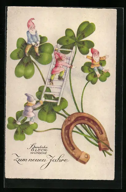 AK Kleine Zwerge mit Kleeblättern und Hufeisen
