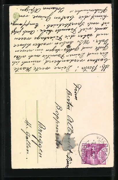 Personenbezogene Daten auf der Rückseite der Karte wurden durch blauen Textmarker unkenntlich gemacht. Die blauen Stellen sind auf die Vorderseite durchgeweicht und wirken sich negativ auf das Postkartenfoto aus