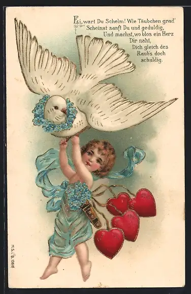AK Kleiner Amor klammert sich an eine weisse Taube