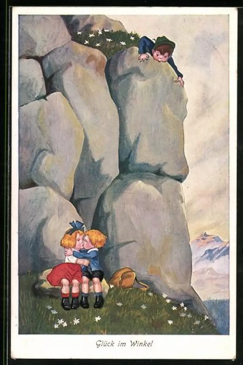 AK Kleiner Bergsteiger blickt auf küssendes Paar hinunter, Glück im Winkel