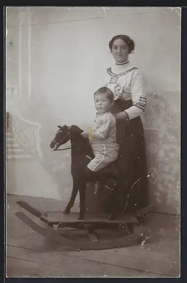 AK Kleiner Junge auf einem Schaukelpferd neben seiner Mutter