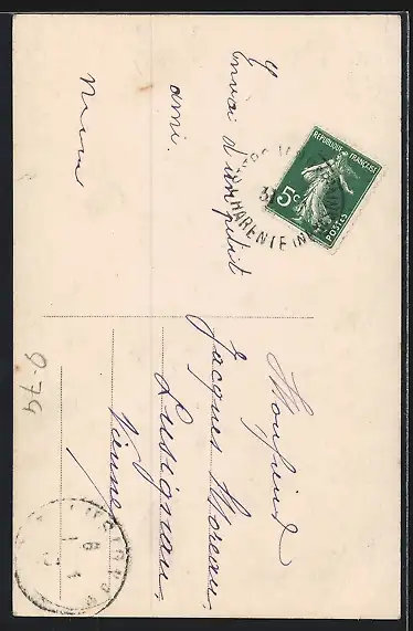 Personenbezogene Daten auf der Rückseite der Karte wurden durch blauen Textmarker unkenntlich gemacht. Die blauen Stellen sind auf die Vorderseite durchgeweicht und wirken sich negativ auf das Postkartenfoto aus