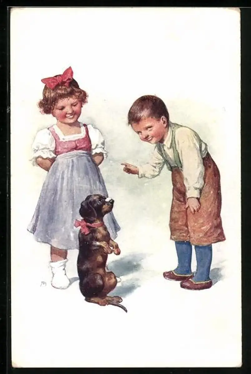 AK Kleiner Junge lässt seinen Dackel Männchen machen