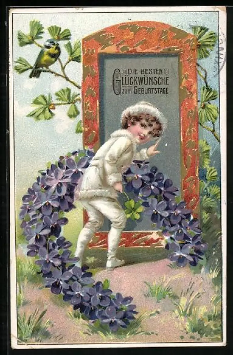 AK Kleiner Junge mit Hufeisen aus Veilchen, Bonne année