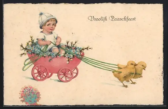 AK Kleiner Junge mit Osterkükengespann, Ostergruss