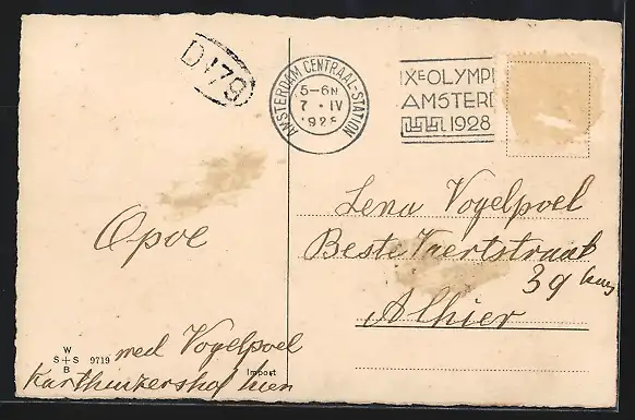 gelaufen 1928, Briefmarke entfernt, rückseitig Oberflächenschaden, rückseitig Klebe- und Papierreste, guter Zustand