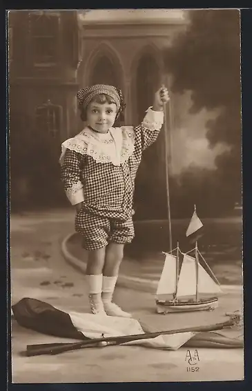 AK Kleiner Junge mit einem Segelschiff als Spielzeug