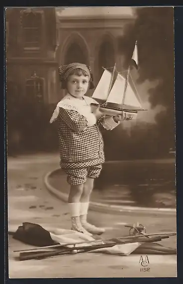 AK Kleiner Junge mit einem Segelschiff in den Händen als Spielzeug