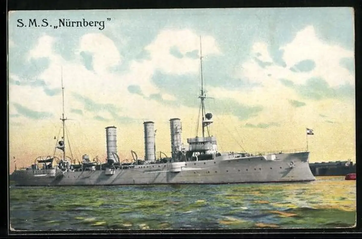 AK Kleiner Kreuzer Nürnberg vom Ostasiengeschwader bei der Hafeneinfahrt