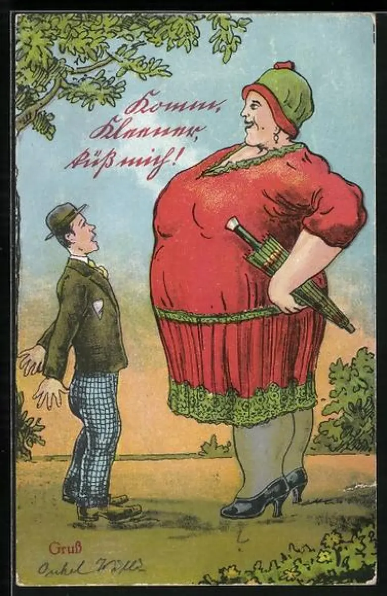 AK Kleiner Mann vor grosser übergewichtiger Frau