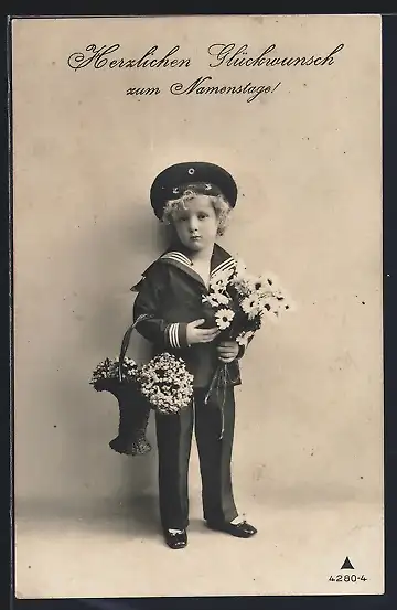 AK Kleiner Matrose mit Blumenstrauss, Glückwunsch zum Namenstag