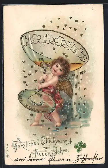 AK Kleiner Neujahrsengel trägt ein Sektglas