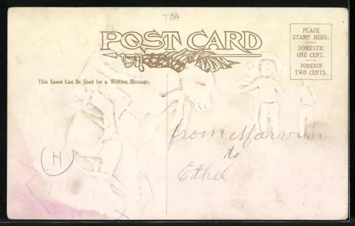 Personenbezogene Daten auf der Rückseite der Karte wurden durch blauen Textmarker unkenntlich gemacht. Die blauen Stellen sind auf die Vorderseite durchgeweicht und wirken sich negativ auf das Postkartenfoto aus