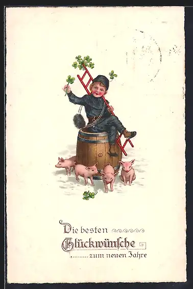 AK Kleiner Schornsteinfeger auf einem Fass, Neujahrsgruss