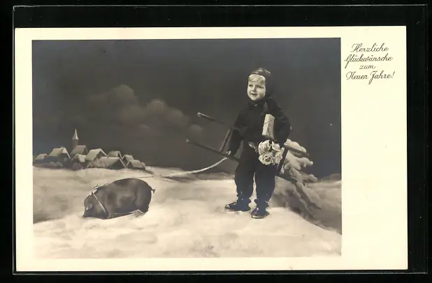 AK Kleiner Schornsteinfeger mit Glücksschwein