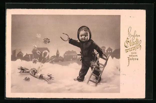 AK Kleiner Schornsteinfeger mit Hufeisen gratuliert zu Neujahr