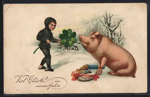 AK Kleiner Schornsteinfeger mit Kleeblatt und Glücksschwein