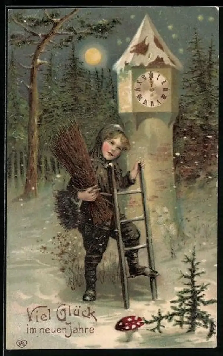 AK Kleiner Schornsteinfeger neben einer Turmuhr im winterlichen Wald, Neujahrsgruss