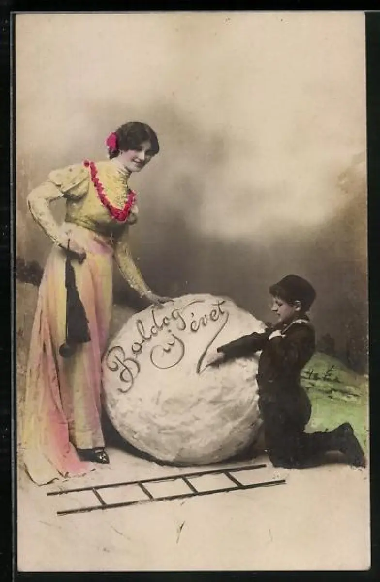 AK Kleiner Schornsteinfeger schreibt Boldeg uj évet auf einen Schneeball