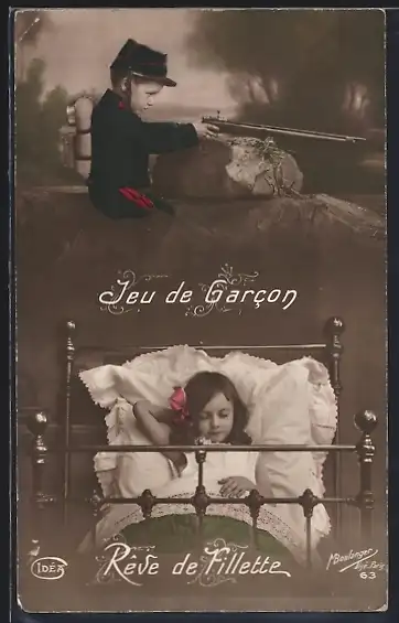 AK Kleiner Soldat in Uniform mit Gewehr, Mädchen im Bett