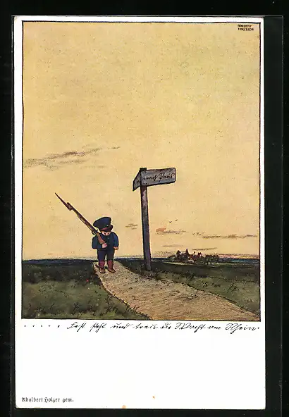 AK Kleiner Soldat mit Gewehr am Wegweiser