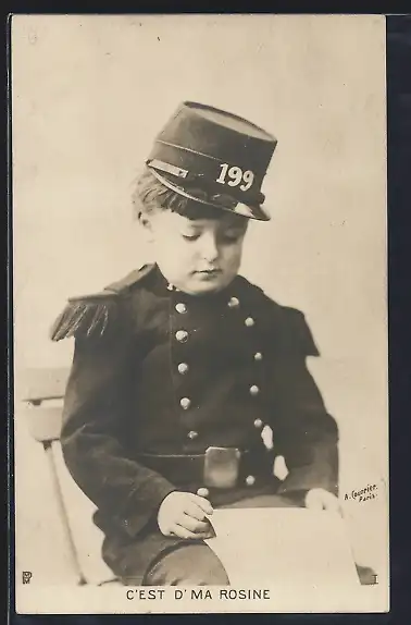 AK Kleiner Soldat mit Schirmmütze Reg. No. 199 liest einen Brief