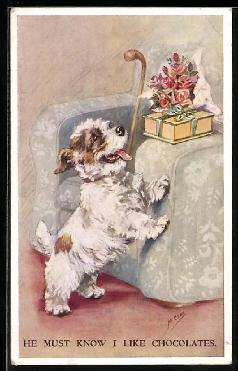 AK Kleiner Terrier freut sich über Schokolade, die nicht für ihn gedacht ist