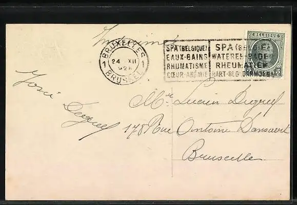 Personenbezogene Daten auf der Rückseite der Karte wurden durch blauen Textmarker unkenntlich gemacht. Die blauen Stellen sind auf die Vorderseite durchgeweicht und wirken sich negativ auf das Postkartenfoto aus