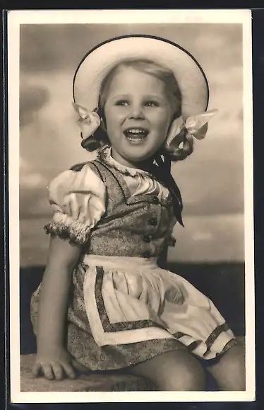 AK Kleines Dirndl-Mädchen mit Strohhut am Meer