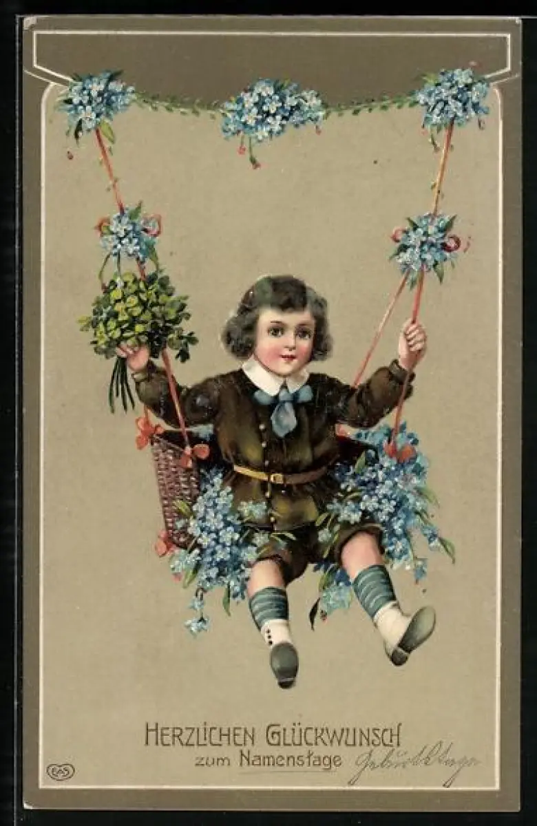 AK Kleines Kind auf blumengeschmückter Schaukel