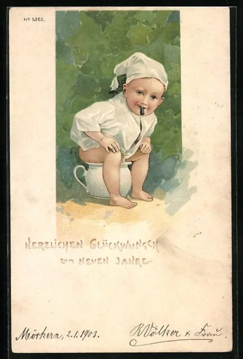 AK Kleines Kind auf einem Nachttopf. Neujahrsgruss