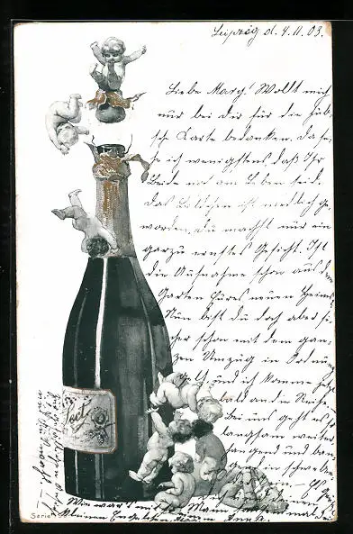 AK Kleines Kindlein sitzt auf einem knallenden Sektkorken, Wein