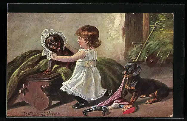 AK Kleines Mädchen beim Spiel mit zwei Dackeln