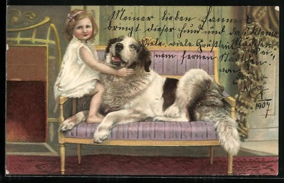 AK Kleines Mädchen mit Bernhardiner auf einer Sitzbank