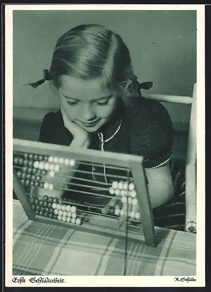 AK Kleines Mädchen mit Rechenschieber, Erste Schularbeit