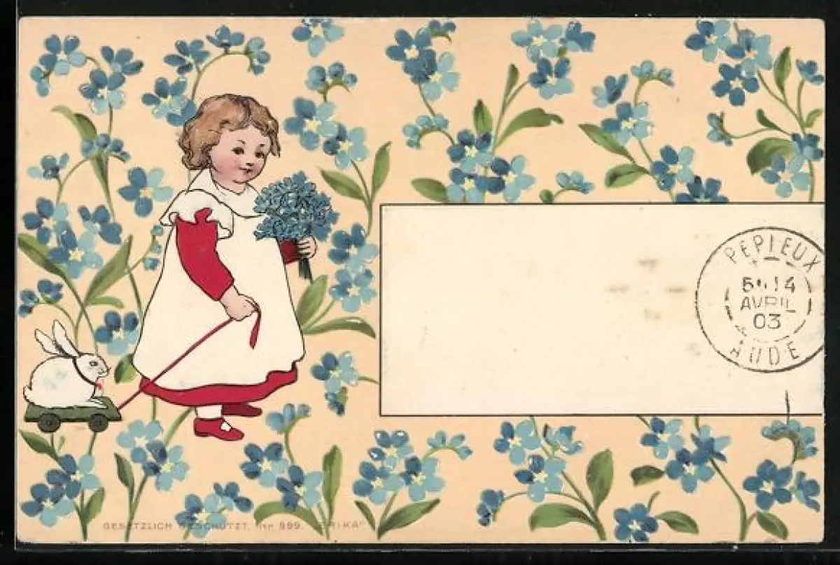 AK Kleines Mädchen mit Spielzeughasen beim Blumenpflücken