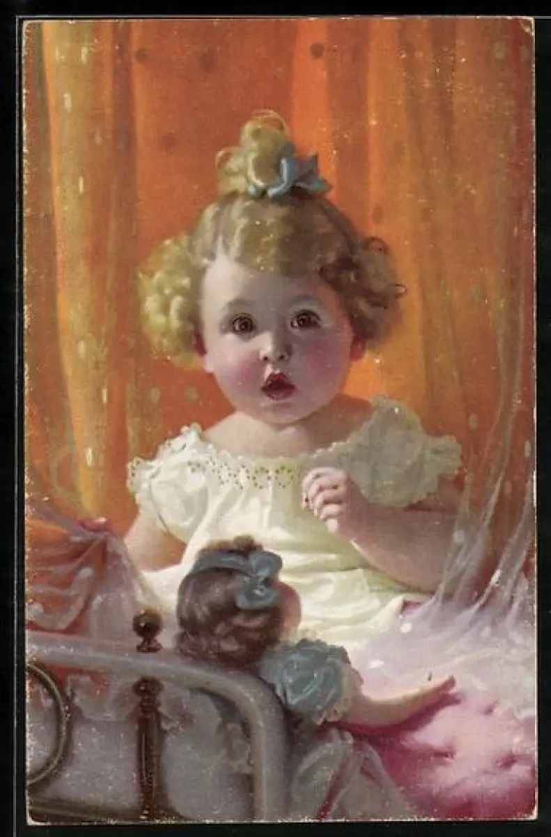 AK Kleines Mädchen mit überraschtem Gesicht und Puppe