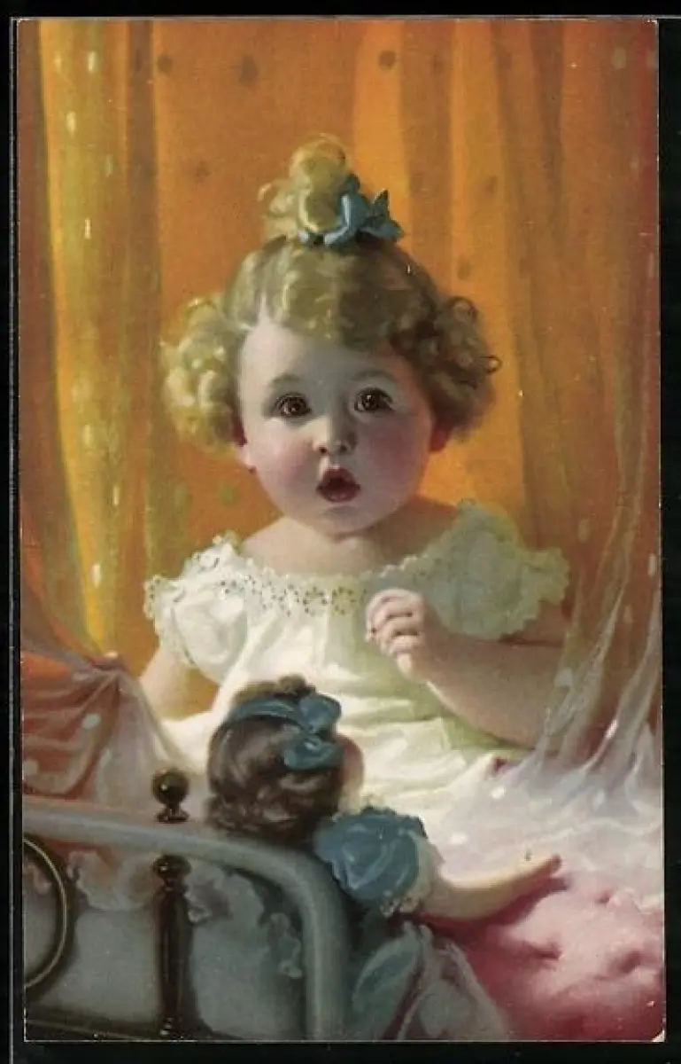 AK Kleines Mädchen mit überraschtem Gesicht und Puppe